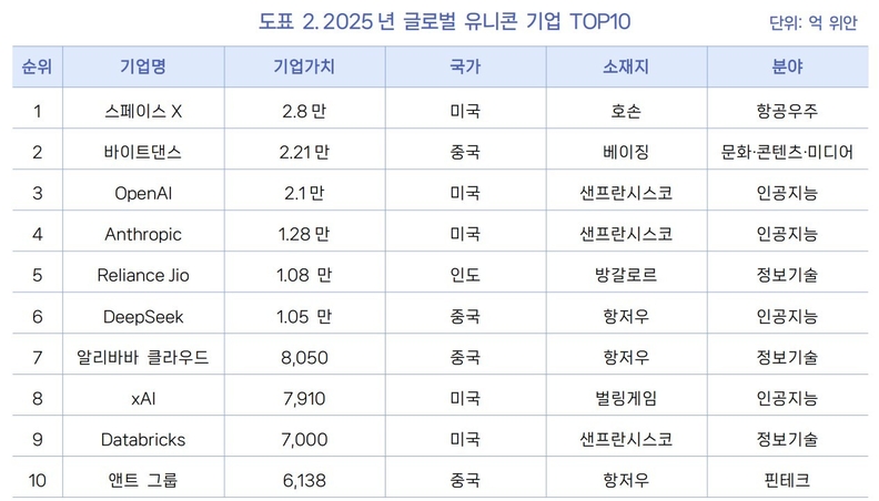 <2025 글로벌 500대 유니콘 기업 보고서>는 유니콘 기업이 더 이상 단기 고성장 스타트업의 대명사가 아니라, 글로벌 산업 구조를 재편하는 핵심 주체로 이동하고 있음을 보여준다. 기술 경쟁과 산업 전환이 동시에 진행되는 환경에서 유니콘 기업의 성격과 역할이 질적으로 변화하고 있다는 점을 수치와 사례를 통해 제시했다.