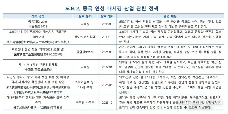 중국제조 2025는 영상 장비와 의료용 로봇 등 고성능 진단·치료 장비의 개발을 핵심 과제로 제시하며, 내시경 기술 고도화를 장기 과제로 포함했다.
