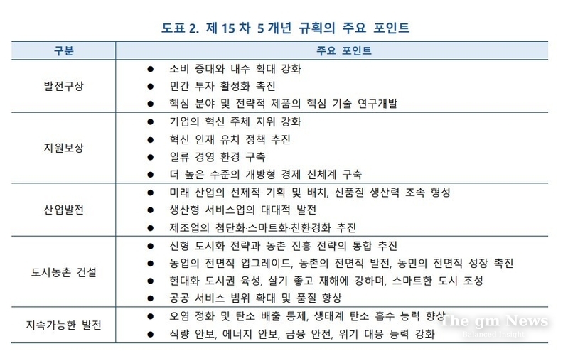 KIC중국은 제15차 5개년 규획이 산업·기술·환경·지역 개발의 전분야를 긴밀하게 재조정하는 성격을 갖고 있다고 설명했다.