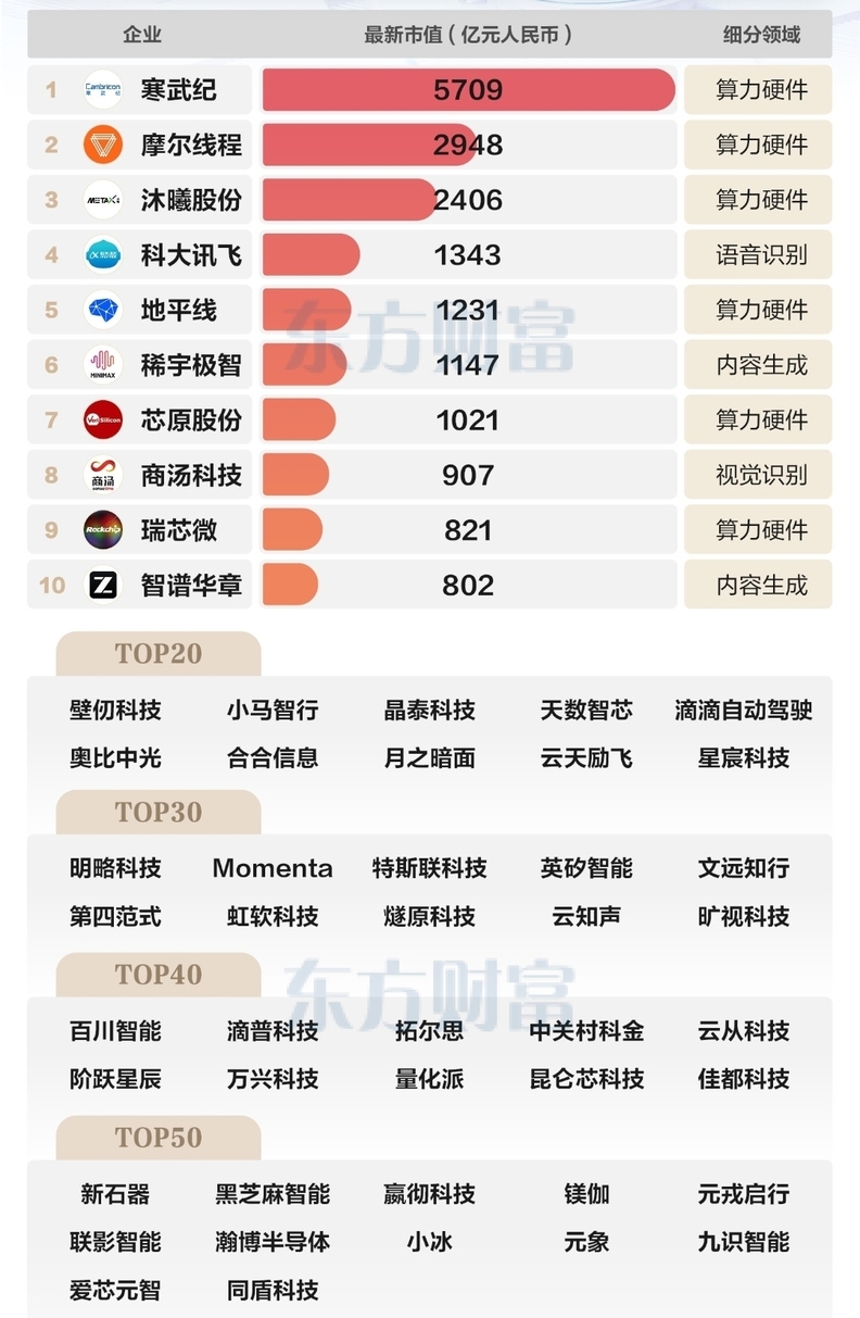 22일 이스트머니 리서치 센터에 따르면, 최근 후룬연구원은 ‘2025 후룬 중국 인공지능 보고서’를 통해 AI 컴퓨팅 파워 또는 알고리즘을 핵심 사업으로 삼는 중국 기업 52곳을 선정해 기업 가치 기준 순위를 발표했다.