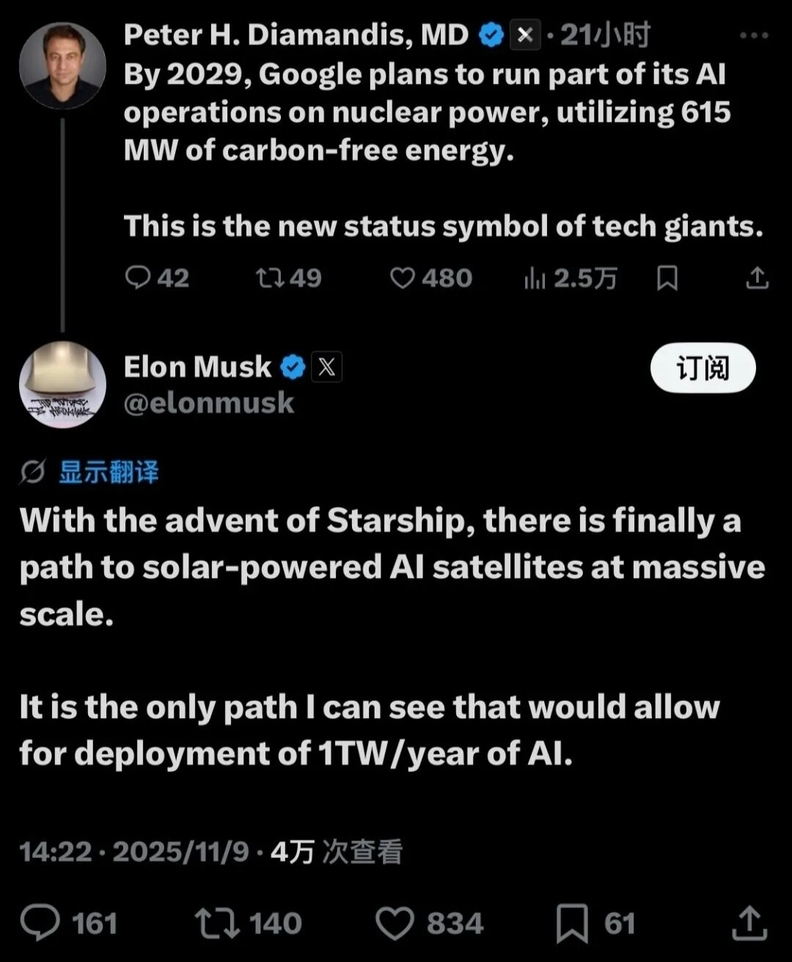 9일 중국 메이르징지신원(每日经济新闻, Meiri Jingji Xinwen)에 따르면, 마스크는 X(구 트위터)에서 “스타십(Starship)의 등장으로 대규모 태양광 AI 위성망 구축이 현실화됐다”고 발표했다. 이는 구글이 2029년 핵에너지를 활용한 데이터센터를 운영하겠다고 밝힌 데 대한 응답이었다.