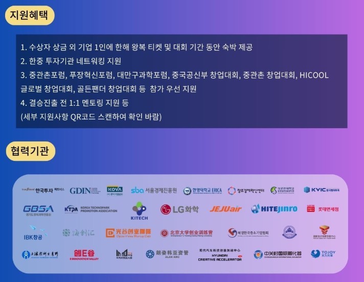 대회 이후에도 한중 투자기관 네트워킹, 중관촌포럼·HICOOL 글로벌 창업대회 등 중국 국가급 프로그램 연계, KIC중국 인큐베이션·엑셀러레이션 프로그램 참여 기회가 이어진다.