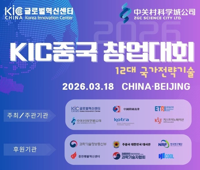 더지엠뉴스 송종환 기자 | 중국 시장을 향한 한국 기술창업 기업들의 진입을 구조적으로 지원하는 대형 무대가 베이징에서 열린다. 글로벌혁신센터(KIC중국)가 주관하는 2026년 KIC중국 창업대회는 기술 경쟁력과 중국 진출 가능성을 동시에 검증하는 실전형 경연으로 기획됐다.