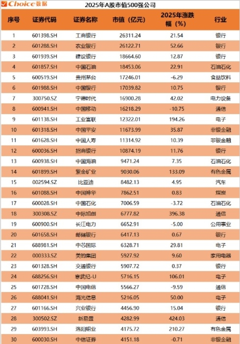 1조 위안 이상 시가총액을 기록한 기업은 12곳으로 늘어났다. 2024년 대비 4곳이 추가됐으며, 산업푸롄·중국핑안·중국인수·초상은행이 새롭게 1조 위안 클럽에 진입했다. 국유 대형 은행과 에너지·통신·첨단제조 기업이 이 명단의 대부분을 차지했다.