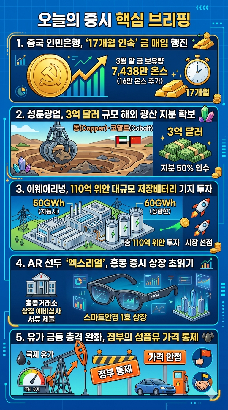 더지엠뉴스 정은영 기자 | 중국 중앙은행이 3월에도 금 보유를 늘리며 금 매입 기조를 17개월째 이어갔다. 광산과 저장에너지 기업들이 대형 인수와 증설에 나서며 자원 확보 경쟁과 배터리 생산 확대가 동시에 진행됐다. 중국 정부가 산업망·공급망 안전 규정을 시행하고 에너지 가격 조정과 유동성 관리까지 병행하며 경제 안정 장치를 강화했다.