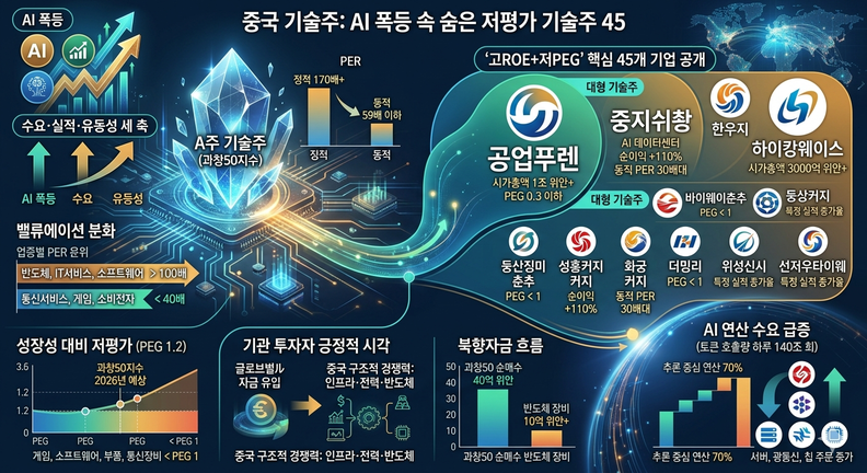 더지엠뉴스 정은영 기자 | A주 기술주 급등 속에서도 성장 대비 저평가된 종목군이 따로 존재하는 것으로 나타났다. 특히 반도체와 AI 인프라 기업을 중심으로 수익성과 성장성을 동시에 갖춘 종목이 집중 포착됐다.