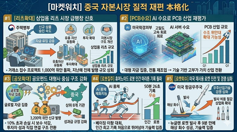 더지엠뉴스 정은영 기자 | 상업용 리츠 확대와 증권사 M&A로 중국 자본시장 구조 재편이 가속됐다. AI 수요 확대로 PCB와 광섬유 등 핵심 산업 가치가 재평가되며 자금이 집중됐다. 휴머노이드 로봇 기록 돌파와 미중 기술 경쟁 속에서 산업 패러다임 변화가 본격화됐다.