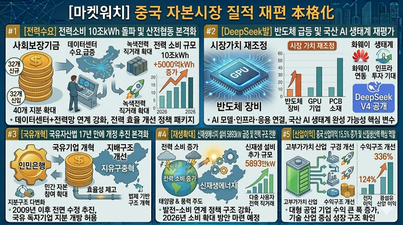 더지엠뉴스 조익철 기자 | DeepSeek V4 발표와 함께 중국 A주에서 반도체·전자 중심 자금 쏠림이 강화됐다. 전력 수요 10조kWh 돌파 전망과 데이터센터 연계 정책이 맞물리며 에너지·AI 구조 재편이 동시에 진행됐다. 국유자산법 개정과 무디스 전망 상향, 산업이익 증가가 중국 경제의 제도·재정·산업 기반 확대를 보여줬다.